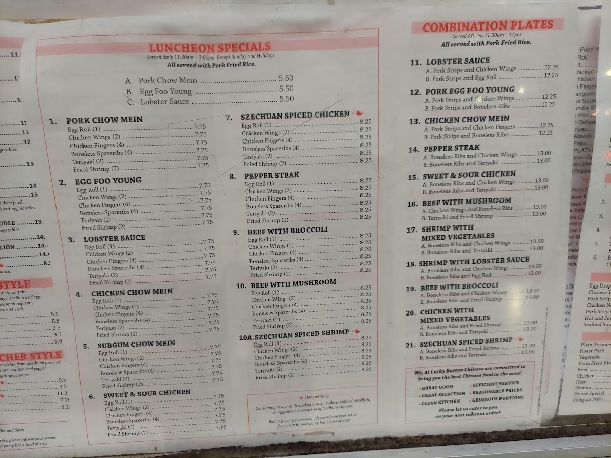 Lucky Boston Chinese offers a straightforward and satisfying menu that fits perfectly into a casual dining or takeout experience. The menu features classic Chinese fast food favorites that are both comforting and familiar, ideal for a quick lunch or a relaxed dinner at home.